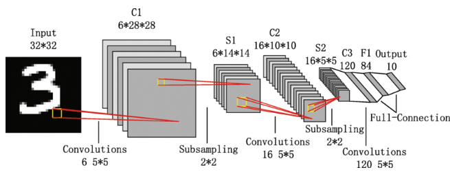 2) 합성곱층: 5X5 크기의 6개 필터 사용, 28x28x6의 출력, Sigmoid 또는 Tanh 사용, 저수준의 특징 추출
