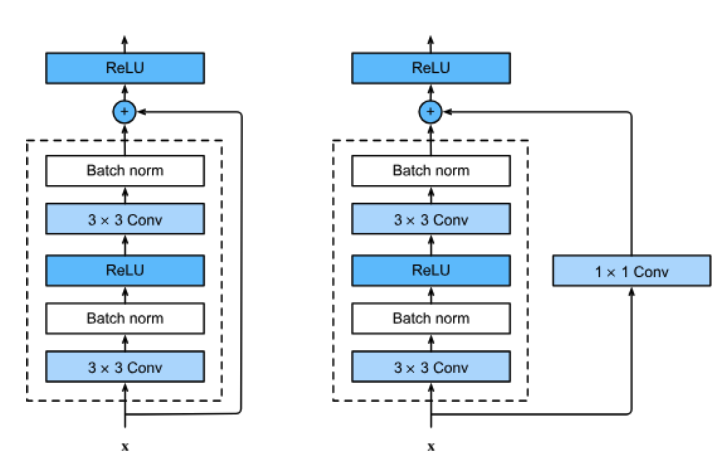 - 각 층이 학습할 함수를 잔차로 표현, 입력을 출력에 더하는 스킵 연결 도입