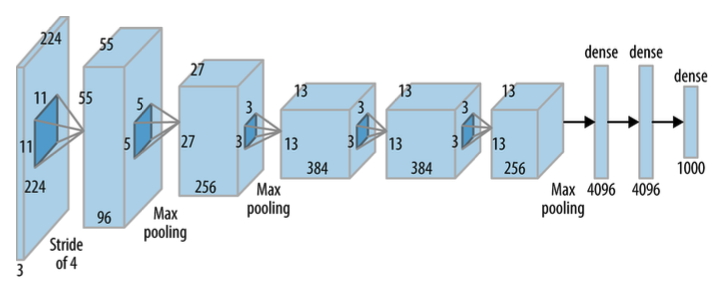 - 완전연결층: 4096개의 뉴런, ReLU, 드롭아웃 0.5의 완전연결층 2개, 1000개의 뉴런, Softmax 갖는 완전연결층 1개