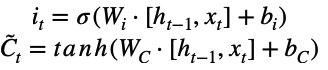 it는 입력 게이트의 활성화 값, ~Ct는 후보 셀 상태, tanh는 하이퍼볼릭 탄젠트 함수